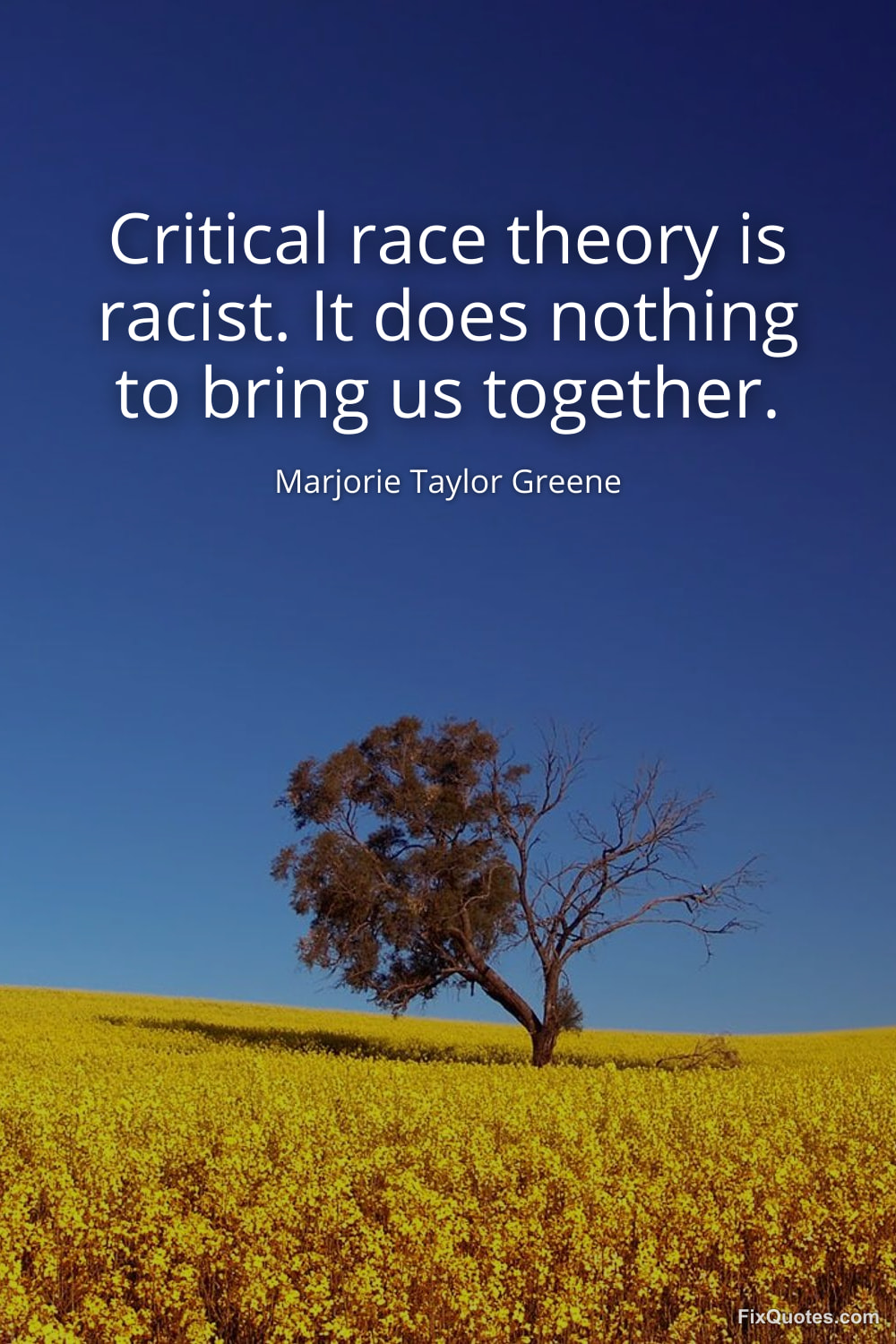 Greene, Marjorie Taylor. "Critical race theory is racist. It does nothing to bring us together." FixQuotes. January 15, 2026. https://fixquotes.com/quotes/critical-race-theory-is-racist-it-does-nothing-to-173543/.