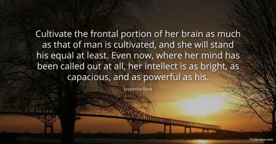 Rose, Ernestine. (2026, January 17). Cultivate the frontal portion of her brain as much as that of man is cultivated, and she will stand his equal at least. Even now, where her mind has been called out at all, her intellect is as bright, as capacious, and as powerful as his. FixQuotes. https://fixquotes.com/quotes/cultivate-the-frontal-portion-of-her-brain-as-57360/