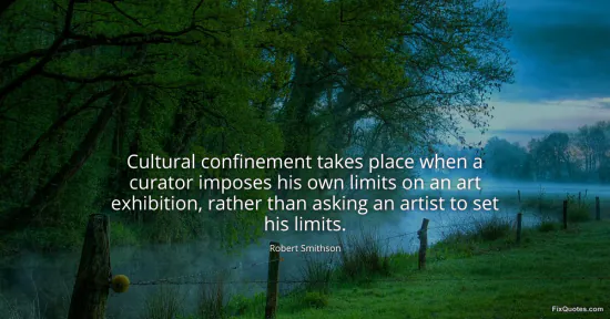 Smithson, Robert. (2026, January 16). Cultural confinement takes place when a curator imposes his own limits on an art exhibition, rather than asking an artist to set his limits. FixQuotes. https://fixquotes.com/quotes/cultural-confinement-takes-place-when-a-curator-96998/