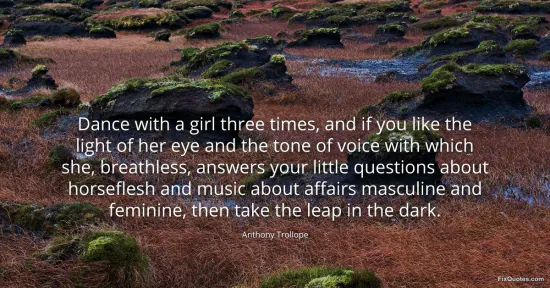 Trollope, Anthony. (2026, January 16). Dance with a girl three times, and if you like the light of her eye and the tone of voice with which she, breathless, answers your little questions about horseflesh and music about affairs masculine and feminine, then take the leap in the dark. FixQuotes. https://fixquotes.com/quotes/dance-with-a-girl-three-times-and-if-you-like-the-138508/