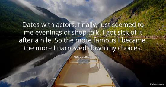 Lamarr, Hedy. "Dates with actors, finally, just seemed to me evenings of shop talk. I got sick of it after a hile. So the more famous I became, the more I narrowed down my choices." FixQuotes. January 17, 2026. https://fixquotes.com/quotes/dates-with-actors-finally-just-seemed-to-me-55587/.