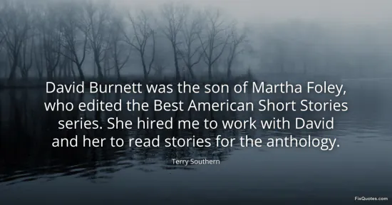 Southern, Terry. "David Burnett was the son of Martha Foley, who edited the Best American Short Stories series. She hired me to work with David and her to read stories for the anthology." FixQuotes. January 15, 2026. https://fixquotes.com/quotes/david-burnett-was-the-son-of-martha-foley-who-165078/.