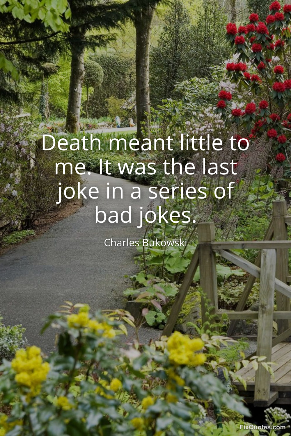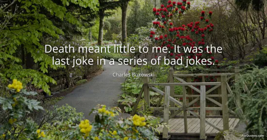 Bukowski, Charles. (2026, February 10). Death meant little to me. It was the last joke in a series of bad jokes. FixQuotes. https://fixquotes.com/quotes/death-meant-little-to-me-it-was-the-last-joke-in-185184/