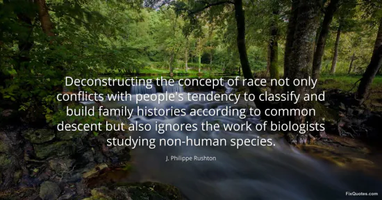 Rushton, J. Philippe. "Deconstructing the concept of race not only conflicts with people's tendency to classify and build family histories according to common descent but also ignores the work of biologists studying non-human species." FixQuotes. January 17, 2026. https://fixquotes.com/quotes/deconstructing-the-concept-of-race-not-only-69633/.