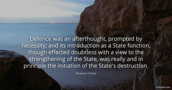 Tucker, Benjamin. "Defence was an afterthought, prompted by necessity; and its introduction as a State function, though effected doubtless with a view to the strengthening of the State, was really and in principle the initiation of the State's destruction." FixQuotes. January 17, 2026. https://fixquotes.com/quotes/defence-was-an-afterthought-prompted-by-necessity-62730/.