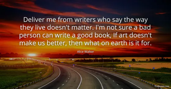 Walker, Alice. (2026, January 17). Deliver me from writers who say the way they live doesn't matter. I'm not sure a bad person can write a good book, If art doesn't make us better, then what on earth is it for. FixQuotes. https://fixquotes.com/quotes/deliver-me-from-writers-who-say-the-way-they-live-36867/