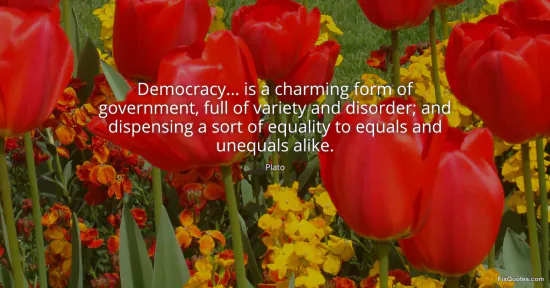 "Democracy... is a charming form of government, full of variety and disorder; and dispensing a sort of equality to equals and unequals alike." FixQuotes, 17 Jan. 2026, https://fixquotes.com/quotes/democracy-is-a-charming-form-of-government-full-27133/. Accessed 10 Feb. 2026.