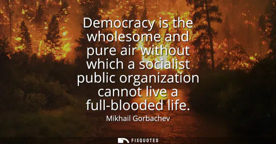 “Wholesome and pure air” is a daring metaphor from a man who spent his career inside an institution that treated open political competition like a contaminant. Gorbachev isn’t praising democracy as a decorative ideal; he’s framing it as infrastructure: invisible, taken for granted when it exists, lethal when it doesn’t. The move is strategic. By describing democracy as oxygen for “a socialist public organization,” he’s trying to rescue socialism from its Soviet synonym: coercion. Socialism, in this telling, isn’t doomed by economics but by suffocation - a closed system where fear replaces feedback and loyalty replaces competence.