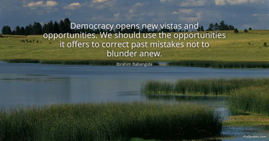Babangida, Ibrahim. "Democracy opens new vistas and opportunities. We should use the opportunities it offers to correct past mistakes not to blunder anew." FixQuotes. January 17, 2026. https://fixquotes.com/quotes/democracy-opens-new-vistas-and-opportunities-we-79782/.