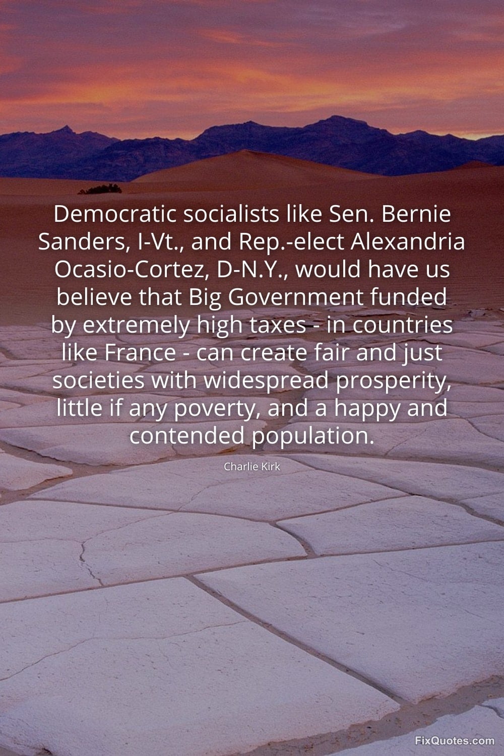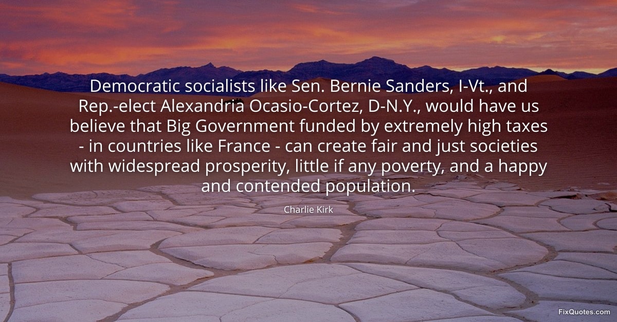 Kirk, Charlie. "Democratic socialists like Sen. Bernie Sanders, I-Vt., and Rep.-elect Alexandria Ocasio-Cortez, D-N.Y., would have us believe that Big Government funded by extremely high taxes - in countries like France - can create fair and just societies with widespread prosperity, little if any poverty, and a happy and contended population." FixQuotes. January 14, 2026. https://fixquotes.com/quotes/democratic-socialists-like-sen-bernie-sanders-173253/.