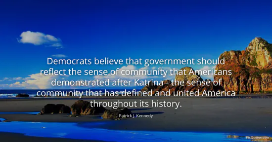 Kennedy, Patrick J. "Democrats believe that government should reflect the sense of community that Americans demonstrated after Katrina - the sense of community that has defined and united America throughout its history." FixQuotes. January 17, 2026. https://fixquotes.com/quotes/democrats-believe-that-government-should-reflect-57550/.