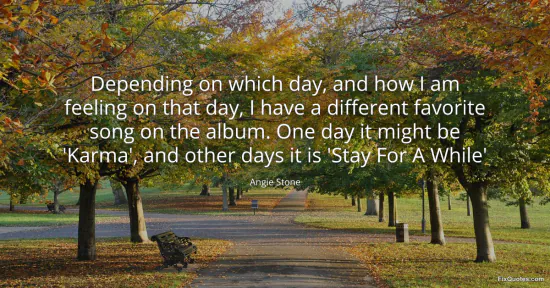 Stone, Angie. (2026, January 17). Depending on which day, and how I am feeling on that day, I have a different favorite song on the album. One day it might be 'Karma', and other days it is 'Stay For A While'. FixQuotes. https://fixquotes.com/quotes/depending-on-which-day-and-how-i-am-feeling-on-37288/