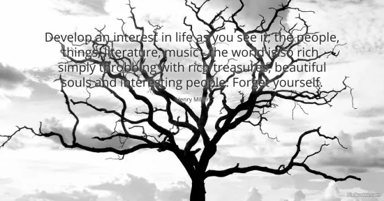 Miller, Henry. (2026, January 17). Develop an interest in life as you see it; the people, things, literature, music - the world is so rich, simply throbbing with rich treasures, beautiful souls and interesting people. Forget yourself. FixQuotes. https://fixquotes.com/quotes/develop-an-interest-in-life-as-you-see-it-the-26525/
