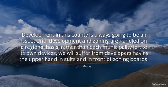 Murray, John. "Development in this county is always going to be an issue. Until development and zoning are handled on a regional basis, rather than each municipality left to its own devices, we will suffer from developers having the upper hand in suits and in front of zoning boards." FixQuotes. January 16, 2026. https://fixquotes.com/quotes/development-in-this-county-is-always-going-to-be-124057/.