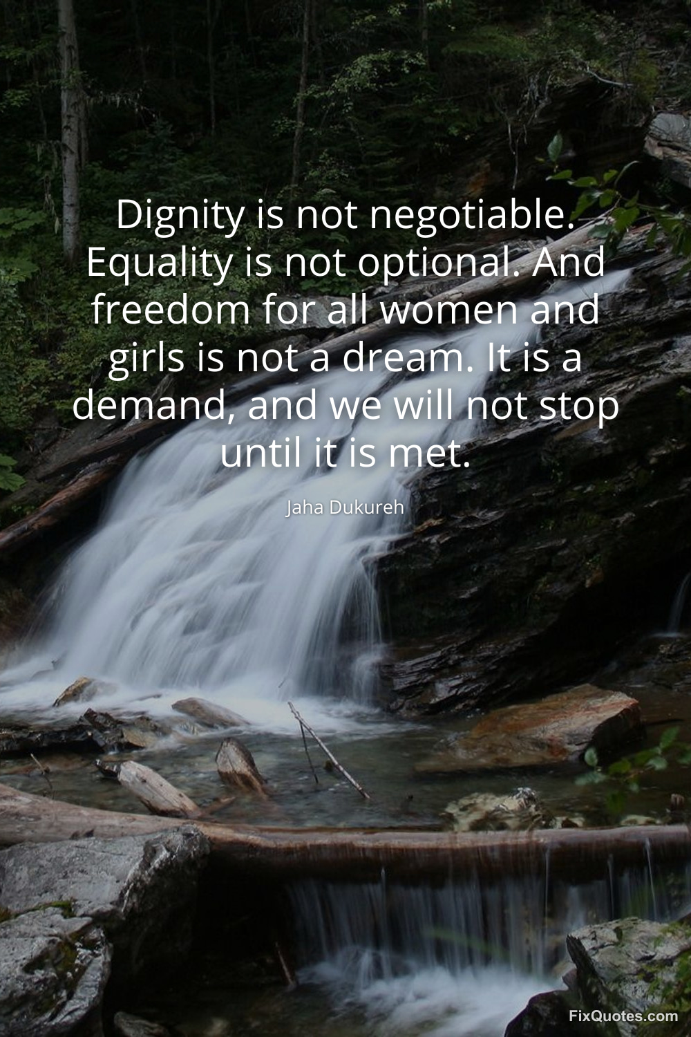 "Dignity is not negotiable. Equality is not optional. And freedom for all women and girls is not a dream. It is a demand, and we will not stop until it is met." FixQuotes, 17 Feb. 2026, https://fixquotes.com/quotes/dignity-is-not-negotiable-equality-is-not-185607/. Accessed 17 Feb. 2026.