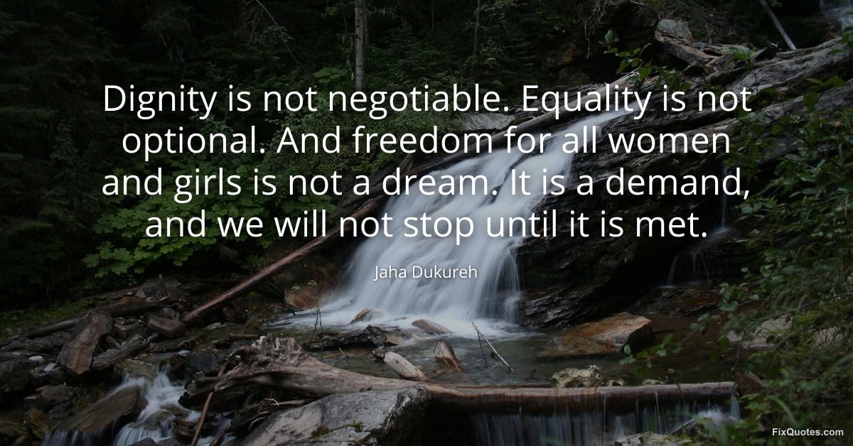 Dukureh, Jaha. (2026, February 17). Dignity is not negotiable. Equality is not optional. And freedom for all women and girls is not a dream. It is a demand, and we will not stop until it is met. FixQuotes. https://fixquotes.com/quotes/dignity-is-not-negotiable-equality-is-not-185607/