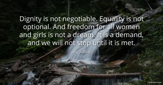 Dukureh, Jaha. "Dignity is not negotiable. Equality is not optional. And freedom for all women and girls is not a dream. It is a demand, and we will not stop until it is met." FixQuotes. February 17, 2026. https://fixquotes.com/quotes/dignity-is-not-negotiable-equality-is-not-185607/.