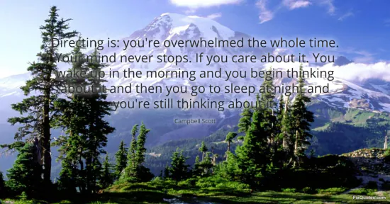 Scott, Campbell. "Directing is: you're overwhelmed the whole time. Your mind never stops. If you care about it. You wake up in the morning and you begin thinking about it and then you go to sleep at night and you're still thinking about it." FixQuotes. January 17, 2026. https://fixquotes.com/quotes/directing-is-youre-overwhelmed-the-whole-time-50413/.