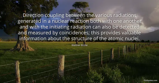 Bothe, Walther. (2026, January 16). Direction coupling between the various radiations generated in a nuclear reaction both with one another and with the initiating radiation can also be detected and measured by coincidences; this provides valuable information about the structure of the atomic nuclei. FixQuotes. https://fixquotes.com/quotes/direction-coupling-between-the-various-radiations-86930/
