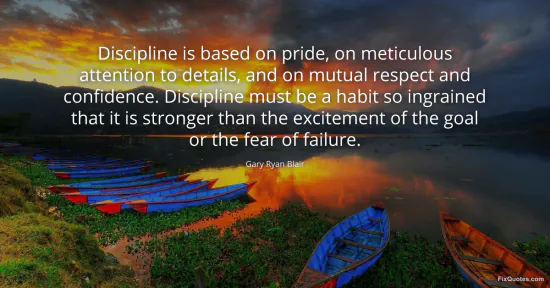 Blair, Gary Ryan. (2026, January 17). Discipline is based on pride, on meticulous attention to details, and on mutual respect and confidence. Discipline must be a habit so ingrained that it is stronger than the excitement of the goal or the fear of failure. FixQuotes. https://fixquotes.com/quotes/discipline-is-based-on-pride-on-meticulous-59210/