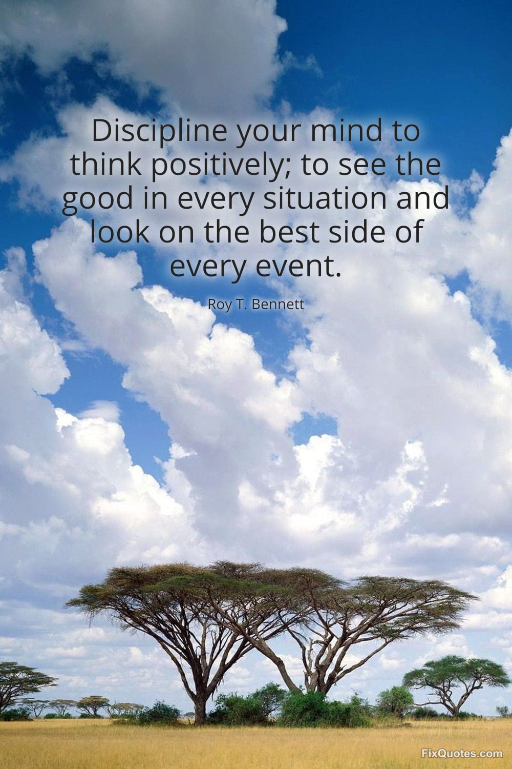 Bennett, Roy T. "Discipline your mind to think positively; to see the good in every situation and look on the best side of every event." FixQuotes. January 11, 2026. https://fixquotes.com/quotes/discipline-your-mind-to-think-positively-to-see-183810/.