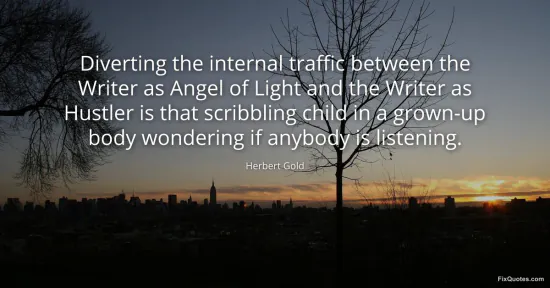 Gold, Herbert. "Diverting the internal traffic between the Writer as Angel of Light and the Writer as Hustler is that scribbling child in a grown-up body wondering if anybody is listening." FixQuotes. January 15, 2026. https://fixquotes.com/quotes/diverting-the-internal-traffic-between-the-writer-148429/.