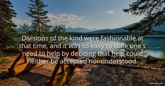 Frame, Janet. "Divisions of the kind were fashionable at that time, and it was so easy to stifle one's need to help by deciding that help could neither be accepted nor understood." FixQuotes. January 15, 2026. https://fixquotes.com/quotes/divisions-of-the-kind-were-fashionable-at-that-149244/.