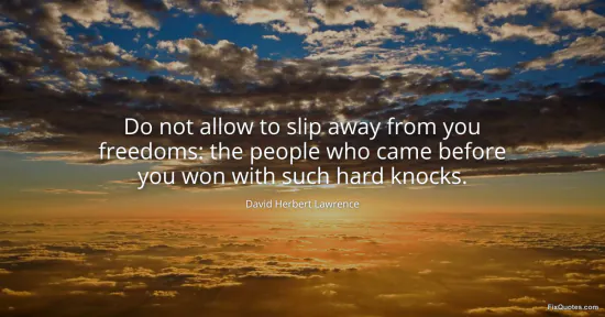 Lawrence, David Herbert. "Do not allow to slip away from you freedoms: the people who came before you won with such hard knocks." FixQuotes. February 20, 2026. https://fixquotes.com/quotes/do-not-allow-to-slip-away-from-you-freedoms-the-6489/.