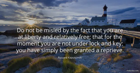 Kapuscinski, Ryszard. "Do not be misled by the fact that you are at liberty and relatively free; that for the moment you are not under lock and key: you have simply been granted a reprieve." FixQuotes. January 16, 2026. https://fixquotes.com/quotes/do-not-be-misled-by-the-fact-that-you-are-at-101935/.
