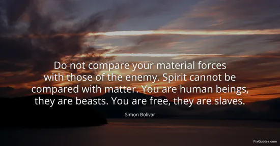 Bolivar, Simon. "Do not compare your material forces with those of the enemy. Spirit cannot be compared with matter. You are human beings, they are beasts. You are free, they are slaves." FixQuotes. January 15, 2026. https://fixquotes.com/quotes/do-not-compare-your-material-forces-with-those-of-172757/.