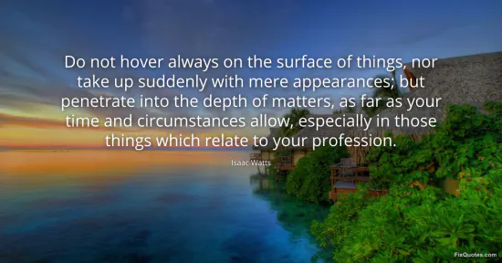 Watts, Isaac. (2026, January 15). Do not hover always on the surface of things, nor take up suddenly with mere appearances; but penetrate into the depth of matters, as far as your time and circumstances allow, especially in those things which relate to your profession. FixQuotes. https://fixquotes.com/quotes/do-not-hover-always-on-the-surface-of-things-nor-161843/
