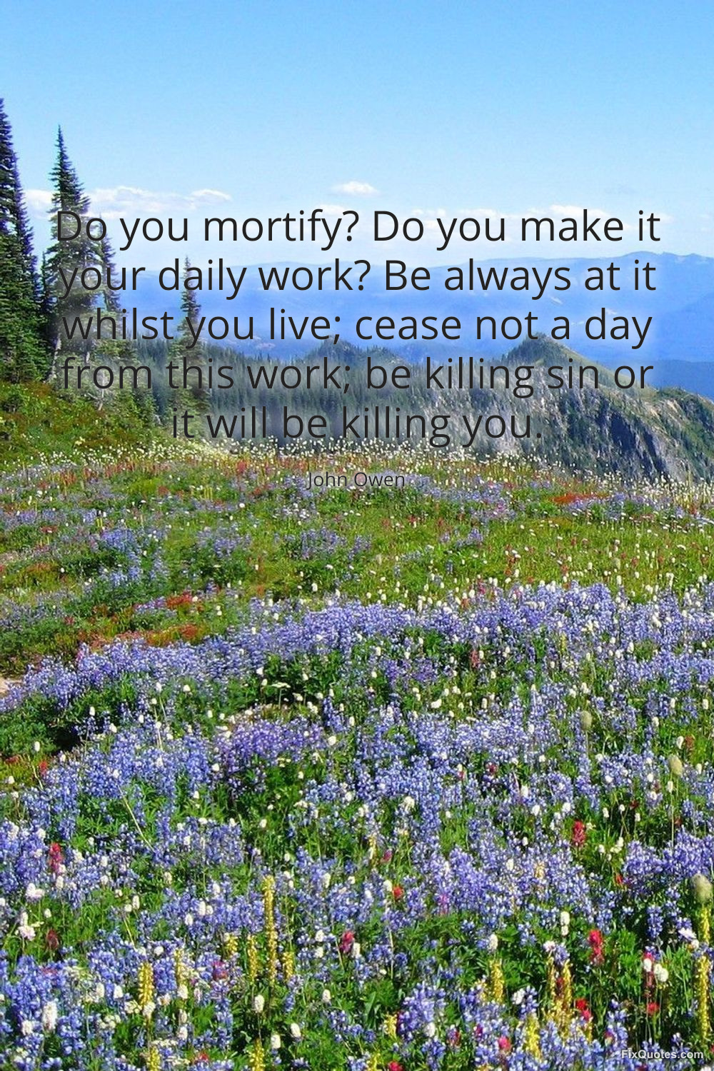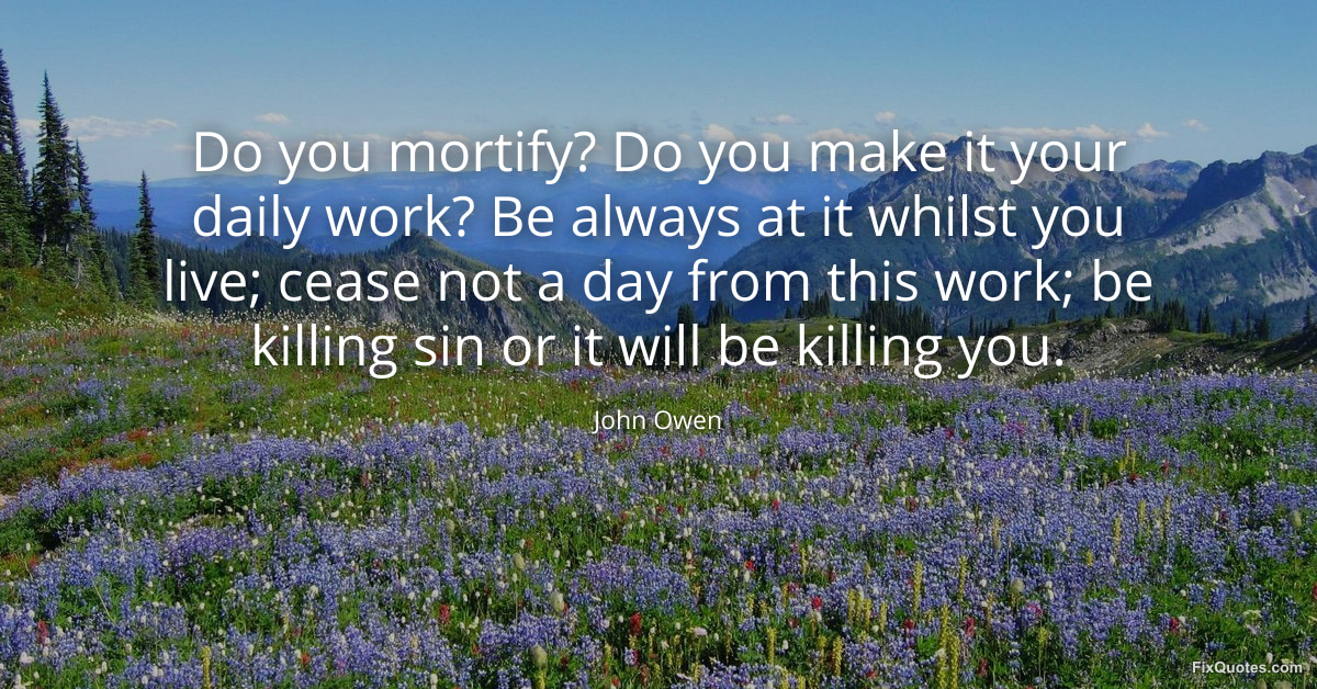 Owen, John. "Do you mortify? Do you make it your daily work? Be always at it whilst you live; cease not a day from this work; be killing sin or it will be killing you." FixQuotes. January 18, 2026. https://fixquotes.com/quotes/do-you-mortify-do-you-make-it-your-daily-work-be-9417/.