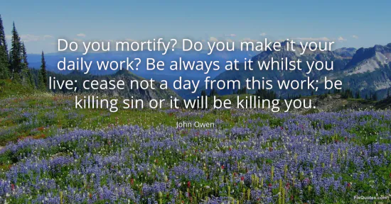 "Do you mortify? Do you make it your daily work? Be always at it whilst you live; cease not a day from this work; be killing sin or it will be killing you." FixQuotes, 18 Jan. 2026, https://fixquotes.com/quotes/do-you-mortify-do-you-make-it-your-daily-work-be-9417/. Accessed 7 Mar. 2026.