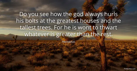 Herodotus. (2026, January 16). Do you see how the god always hurls his bolts at the greatest houses and the tallest trees. For he is wont to thwart whatever is greater than the rest. FixQuotes. https://fixquotes.com/quotes/do-you-see-how-the-god-always-hurls-his-bolts-at-96268/