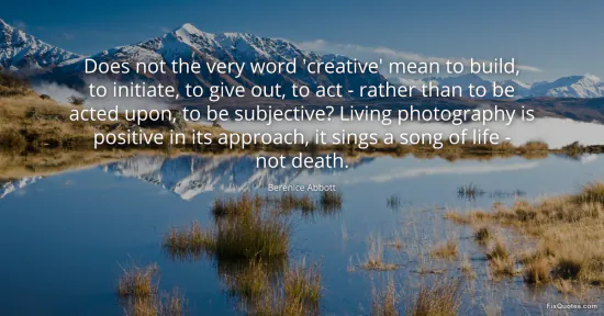Abbott, Berenice. "Does not the very word 'creative' mean to build, to initiate, to give out, to act - rather than to be acted upon, to be subjective? Living photography is positive in its approach, it sings a song of life - not death." FixQuotes. January 17, 2026. https://fixquotes.com/quotes/does-not-the-very-word-creative-mean-to-build-to-44782/.