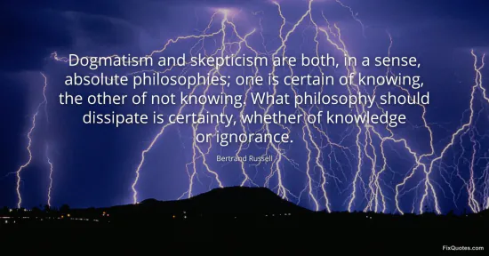 Russell, Bertrand. (2026, January 18). Dogmatism and skepticism are both, in a sense, absolute philosophies; one is certain of knowing, the other of not knowing. What philosophy should dissipate is certainty, whether of knowledge or ignorance. FixQuotes. https://fixquotes.com/quotes/dogmatism-and-skepticism-are-both-in-a-sense-4910/