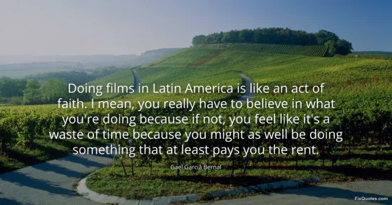 Bernal, Gael Garcia. "Doing films in Latin America is like an act of faith. I mean, you really have to believe in what you're doing because if not, you feel like it's a waste of time because you might as well be doing something that at least pays you the rent." FixQuotes. January 15, 2026. https://fixquotes.com/quotes/doing-films-in-latin-america-is-like-an-act-of-130933/.
