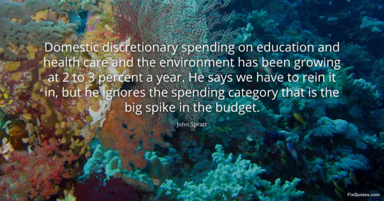 Spratt, John. "Domestic discretionary spending on education and health care and the environment has been growing at 2 to 3 percent a year. He says we have to rein it in, but he ignores the spending category that is the big spike in the budget." FixQuotes. January 15, 2026. https://fixquotes.com/quotes/domestic-discretionary-spending-on-education-and-153631/.