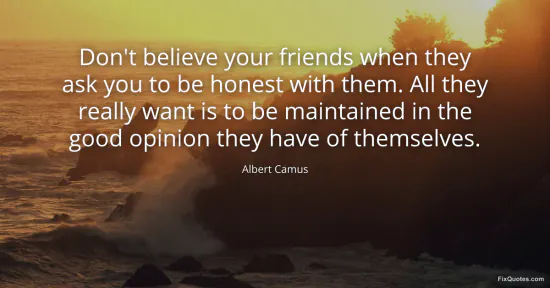 Camus, Albert. "Don't believe your friends when they ask you to be honest with them. All they really want is to be maintained in the good opinion they have of themselves." FixQuotes. January 18, 2026. https://fixquotes.com/quotes/dont-believe-your-friends-when-they-ask-you-to-be-15129/.