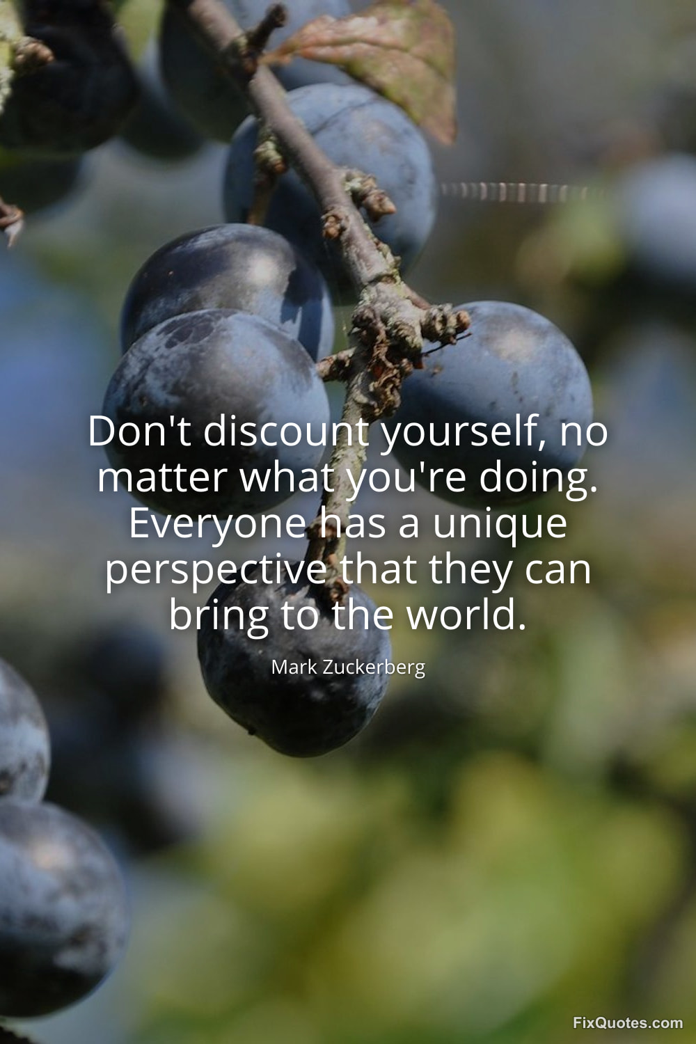 Zuckerberg, Mark. (2026, January 18). Don't discount yourself, no matter what you're doing. Everyone has a unique perspective that they can bring to the world. FixQuotes. https://fixquotes.com/quotes/dont-discount-yourself-no-matter-what-youre-doing-184032/