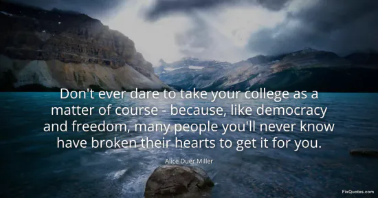 Miller, Alice Duer. (2026, January 16). Don't ever dare to take your college as a matter of course - because, like democracy and freedom, many people you'll never know have broken their hearts to get it for you. FixQuotes. https://fixquotes.com/quotes/dont-ever-dare-to-take-your-college-as-a-matter-132906/