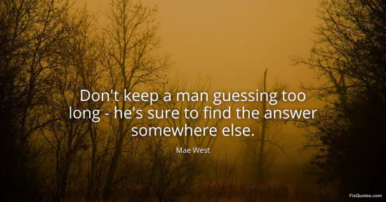 West, Mae. "Don't keep a man guessing too long - he's sure to find the answer somewhere else." FixQuotes. January 17, 2026. https://fixquotes.com/quotes/dont-keep-a-man-guessing-too-long-hes-sure-to-26248/.