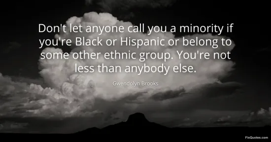 Brooks, Gwendolyn. (2026, February 18). Don't let anyone call you a minority if you're Black or Hispanic or belong to some other ethnic group. You're not less than anybody else. FixQuotes. https://fixquotes.com/quotes/dont-let-anyone-call-you-a-minority-if-youre-72363/