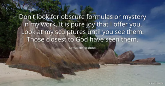Brancusi, Constantin. "Don't look for obscure formulas or mystery in my work. It is pure joy that I offer you. Look at my sculptures until you see them. Those closest to God have seen them." FixQuotes. January 16, 2026. https://fixquotes.com/quotes/dont-look-for-obscure-formulas-or-mystery-in-my-139615/.