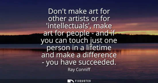 Ray Conniff speaks from a career built on melody, clarity, and broad audiences. He rejects the chase for approval from peers or gatekeepers, arguing that art fulfills its purpose when it meets an ordinary listener at eye level. The quotation marks around intellectuals signal skepticism toward cultural hierarchies that can turn art into an insider conversation. Connection, not prestige, is the point.