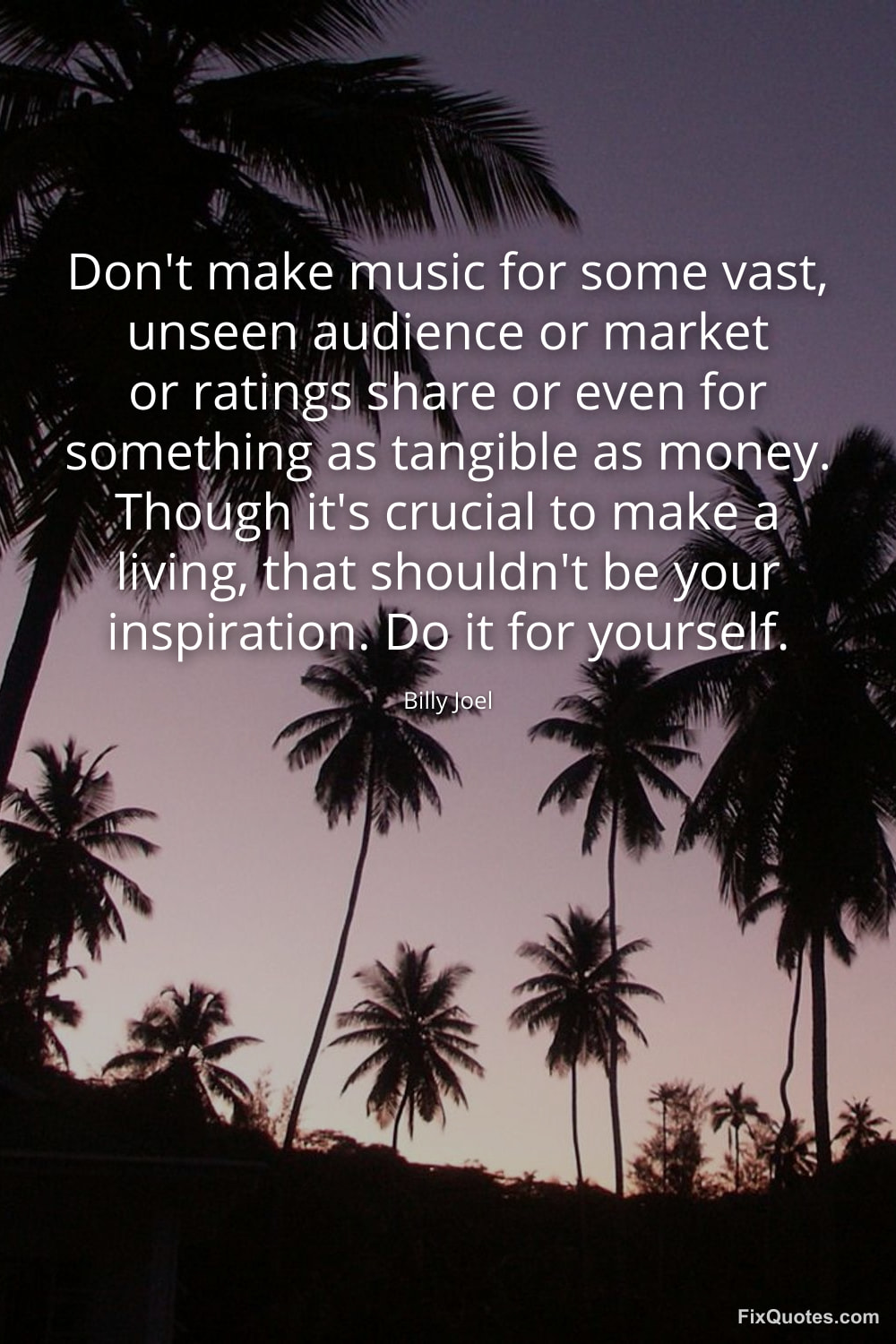 Joel, Billy. (2026, January 17). Don't make music for some vast, unseen audience or market or ratings share or even for something as tangible as money. Though it's crucial to make a living, that shouldn't be your inspiration. Do it for yourself. FixQuotes. https://fixquotes.com/quotes/dont-make-music-for-some-vast-unseen-audience-or-45393/