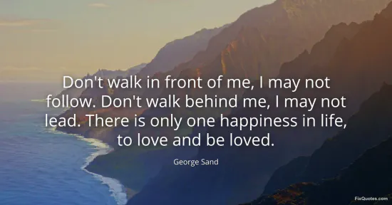"Don't walk in front of me, I may not follow. Don't walk behind me, I may not lead. There is only one happiness in life, to love and be loved." FixQuotes, 15 Jan. 2026, https://fixquotes.com/quotes/dont-walk-in-front-of-me-i-may-not-follow-dont-120549/. Accessed 10 Feb. 2026.