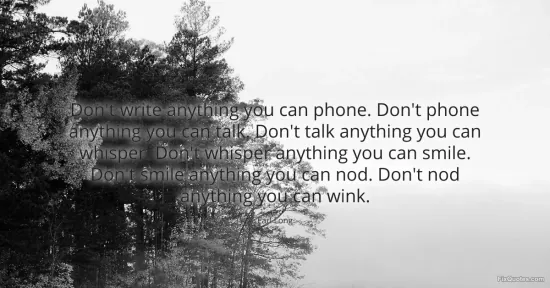 "Don't write anything you can phone. Don't phone anything you can talk. Don't talk anything you can whisper. Don't whisper anything you can smile. Don't smile anything you can nod. Don't nod anything you can wink." FixQuotes, 14 Jan. 2026, https://fixquotes.com/quotes/dont-write-anything-you-can-phone-dont-phone-56082/. Accessed 12 Feb. 2026.