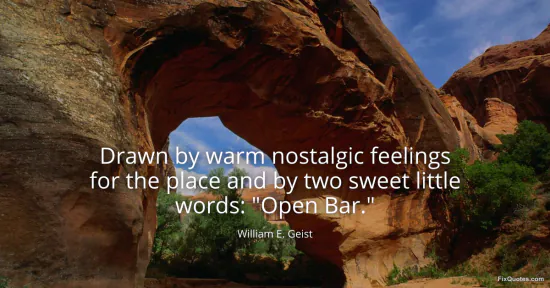 Geist, William E. (2026, January 16). Drawn by warm nostalgic feelings for the place and by two sweet little words: "Open Bar.". FixQuotes. https://fixquotes.com/quotes/drawn-by-warm-nostalgic-feelings-for-the-place-117954/