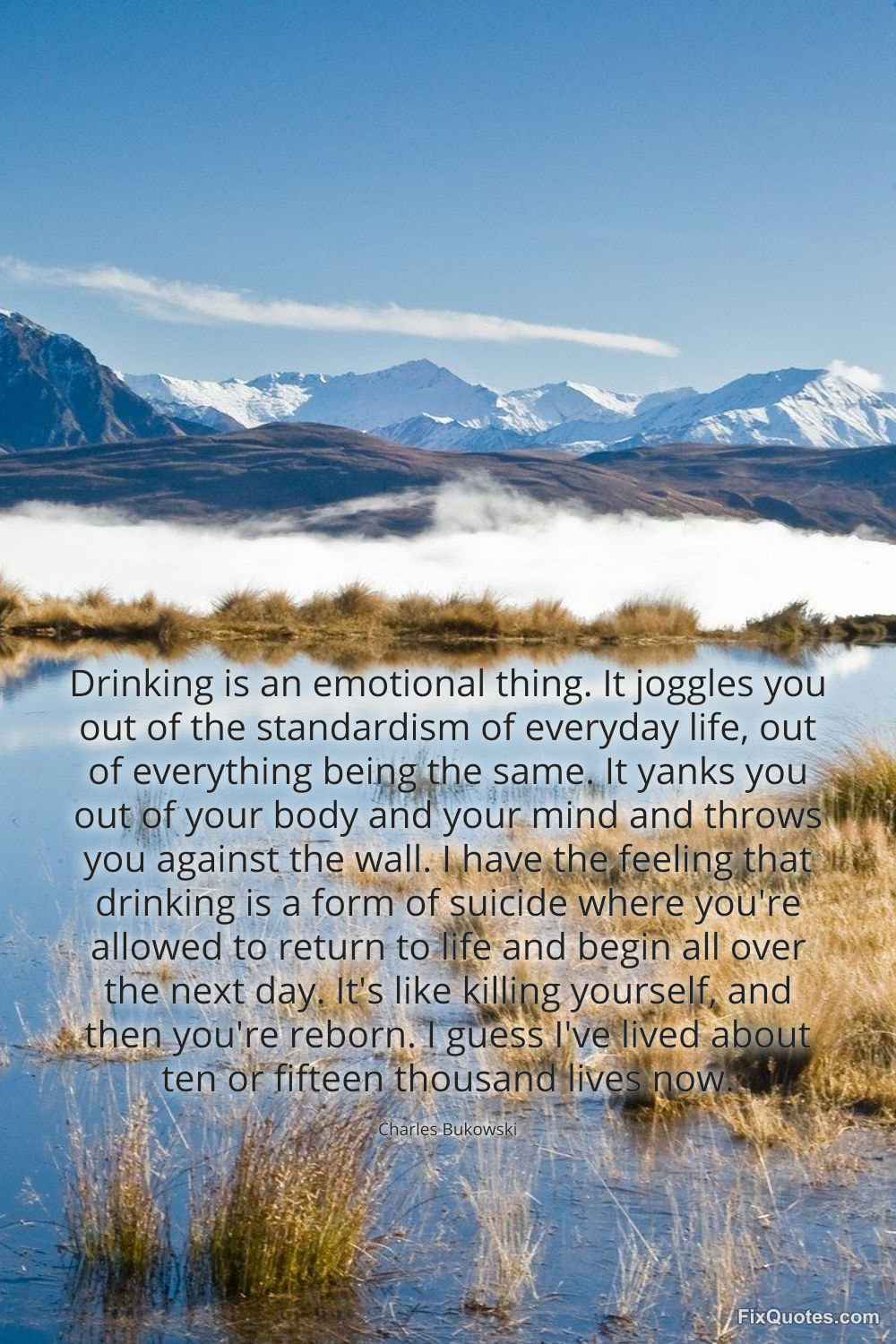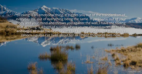 Bukowski, Charles. (2026, February 10). Drinking is an emotional thing. It joggles you out of the standardism of everyday life, out of everything being the same. It yanks you out of your body and your mind and throws you against the wall. I have the feeling that drinking is a form of suicide where you're allowed to return to life and begin all over the next day. It's like killing yourself, and then you're reborn. I guess I've lived about ten or fifteen thousand lives now. FixQuotes. https://fixquotes.com/quotes/drinking-is-an-emotional-thing-it-joggles-you-out-185150/